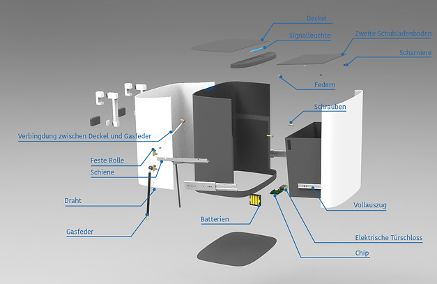 Das Schloss wird automatisch geöffnet, wenn die Drohne kommt. Dann wird die Schublade durch die Gasfeder bewegt. Unter dem ersten Boden der Schublade ist eine Feder. Wenn das Paket kommt, wird der erste Boden nach unten gedrückt, dann wird die Gasfeder geöffnet. Durch das Gewicht wird die Schublade automatisch geschlossen. Während der Paketentnahme wird der Deckel geöffnet, durch die Spannung der Gasfeder wird die ganze Mechanik zurückgesetzt und in die Ausgangslage gebracht - bereit für die nächste Lieferung.